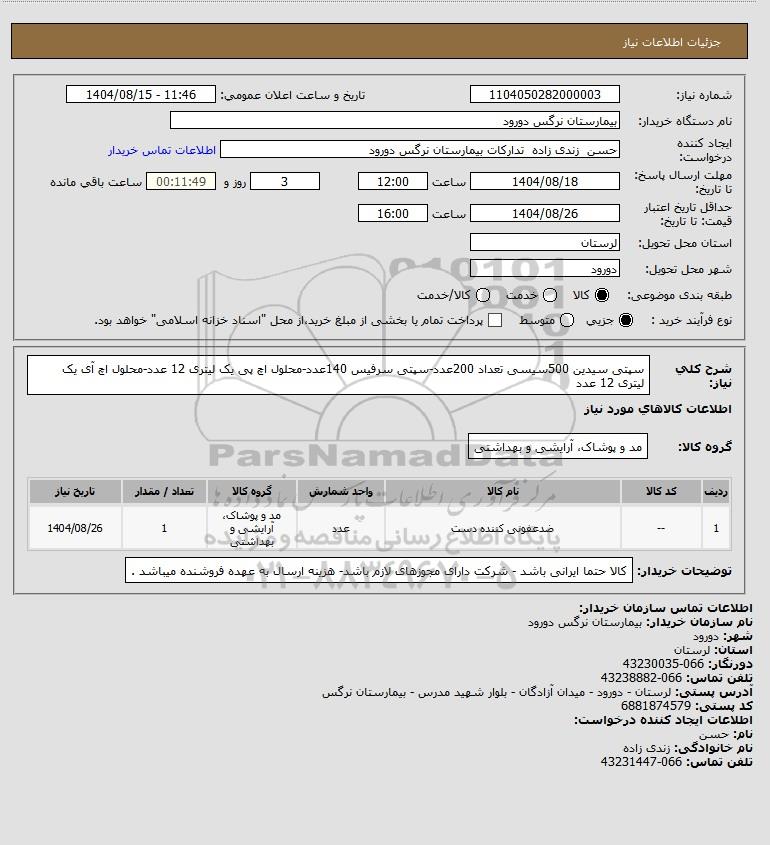 تلفن:5- 88349670 (021) فکس: 88349673 (021) Website: www.ParsNamadData.com E-mail: Info@ParsNamadData.com استعلام سپتی سیدین 500سیسی تعداد 200عدد-سپتی سرفیس 140عدد-محلول اچ پی یک لیتری 12 عدد-محلول اچ آی یک لیتری 12 عدد