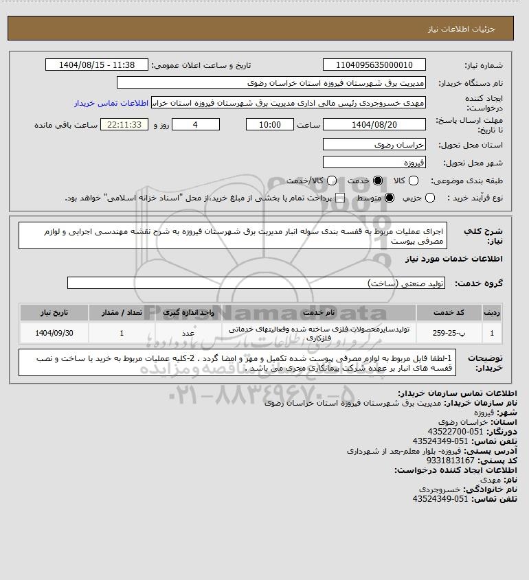 تلفن:5- 88349670 (021) فکس: 88349673 (021) Website: www.ParsNamadData.com E-mail: Info@ParsNamadData.com استعلام اجرای عملیات مربوط به قفسه بندی سوله انبار مدیریت برق شهرستان فیروزه به شرح نقشه مهندسی اجرایی و لوازم مصرفی پیوست