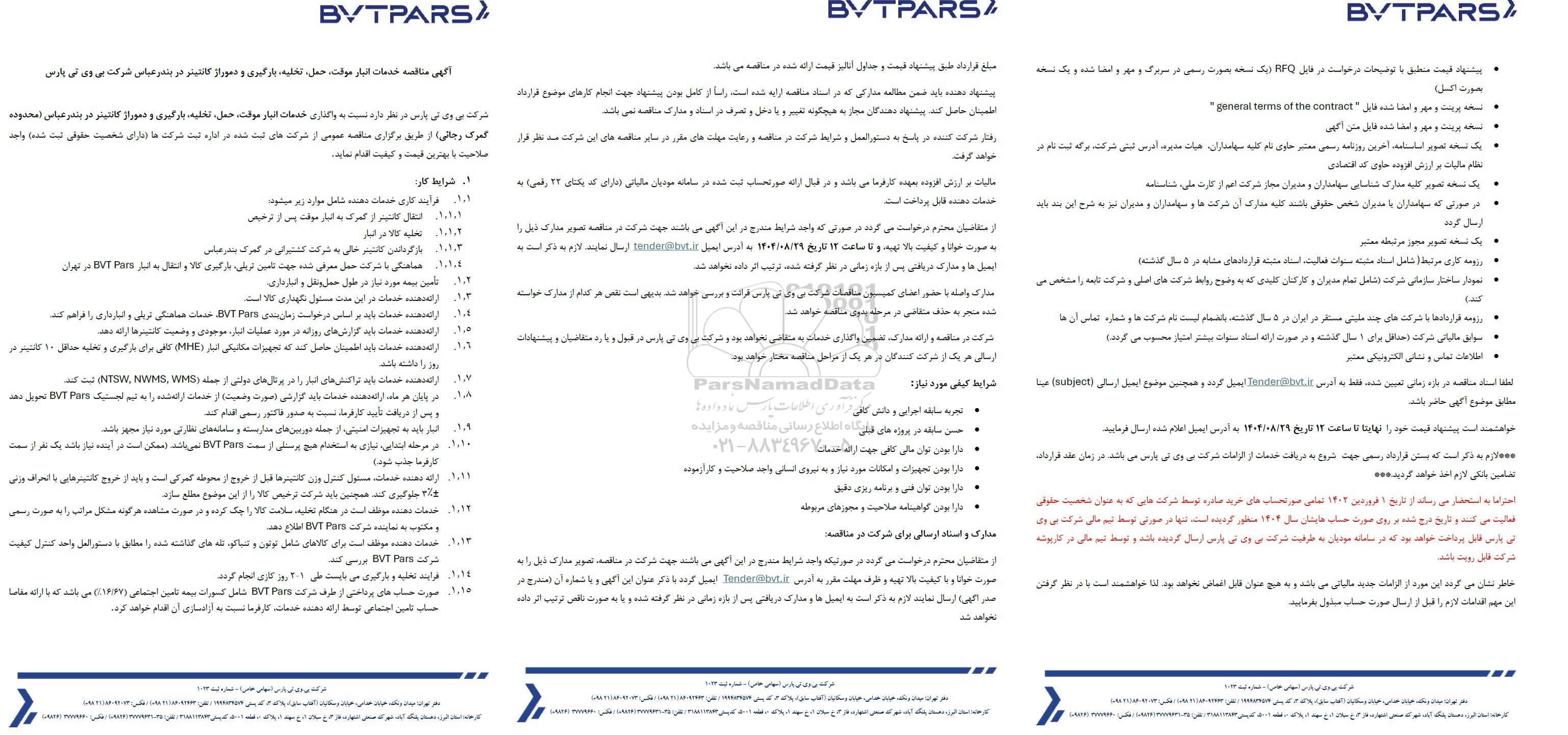 شرکت بی وی تی پارس در نظر دارد نسبت به واگذاری خدمات انبار موقت، حمل، تخلیه، بارگیری و دموراژ کانتینر در بندرعباس (محدوده گمرک رجائی) از طریق برگزاری مناقصه عمومی از شرکت های ثبت شده در اداره ثبت شرکت ها (دارای شخصیت حقوقی ثبت شده) واجد صلاحیت با بهترین قیمت و کیفیت اقدام نماید.