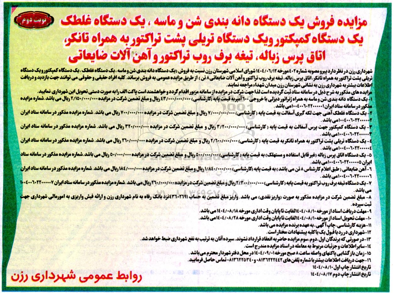 شهرداری رزن در نظر دارد پیرو مصوبه شماره 402 مورخه 1404.06.12 شورای اسلامی شهرستان رزن نسب به فروش (یک دستگاه دانه بندی شن و ماسه، یک دستگاه غلطک ، یک دستگاه کمپکتور و یک دستگاه تریلی پشت تراکتور به همراه تانکر، اتاق پرس زباله تیغه برف روب تراکتور و آهن آلات ضایعاتی 8 تن) از طریق مزایده عمومی به فروش برساند. کلیه افراد حقیقی و حقوقی میتوانند جهت بازدید و دریافت اطلاعات بیشتر به شهرداری رزن به نشانی شهرستان رزن میدان شهداء مراجعه نمایند.