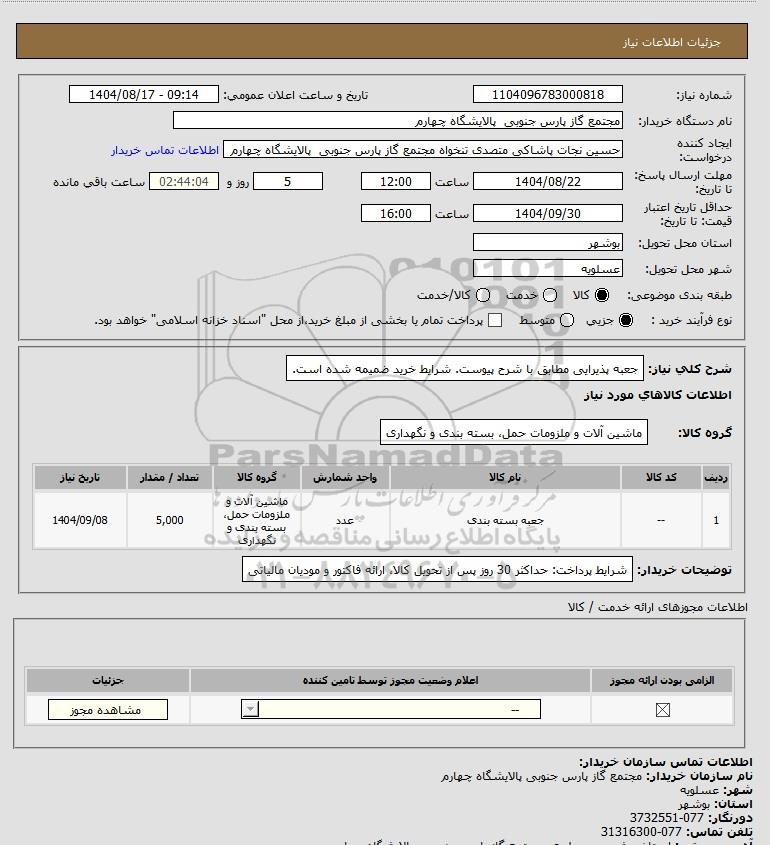 تلفن:5- 88349670 (021) فکس: 88349673 (021) Website: www.ParsNamadData.com E-mail: Info@ParsNamadData.com استعلام جعبه پذیرایی مطابق با شرح پیوست. شرایط خرید ضمیمه شده است.