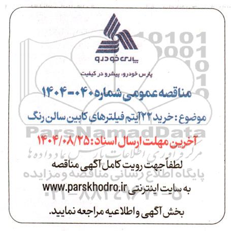 تلفن:5- 88349670 (021) فکس: 88349673 (021) Website: www.ParsNamadData.com E-mail: Info@ParsNamadData.com مناقصه خرید 22 آیتم فیلترهای کابین سالن رنگ