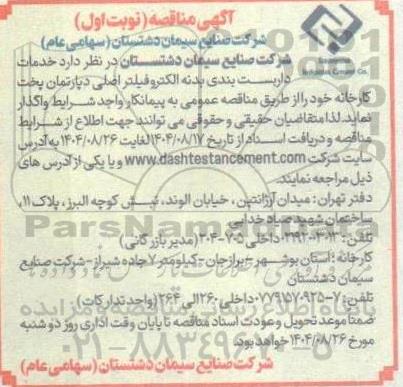 تلفن:5- 88349670 (021) فکس: 88349673 (021) Website: www.ParsNamadData.com E-mail: Info@ParsNamadData.com مناقصه خدمات داربست بندی بدنه الکترو فیلتر اصلی دپارتمان پخت کارخانه