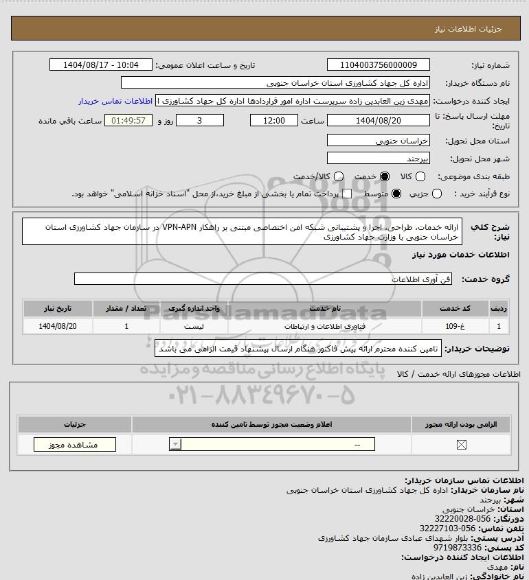 تلفن:5- 88349670 (021) فکس: 88349673 (021) Website: www.ParsNamadData.com E-mail: Info@ParsNamadData.com استعلام ارائه خدمات طراحی اجرا و پشتیبانی شبکه امن اختصاصی مبتنی بر راهکار VPN-APN در سازمان جهاد کشاورزی استان خراسان جنوبی با وزارت جهاد کشاورزی