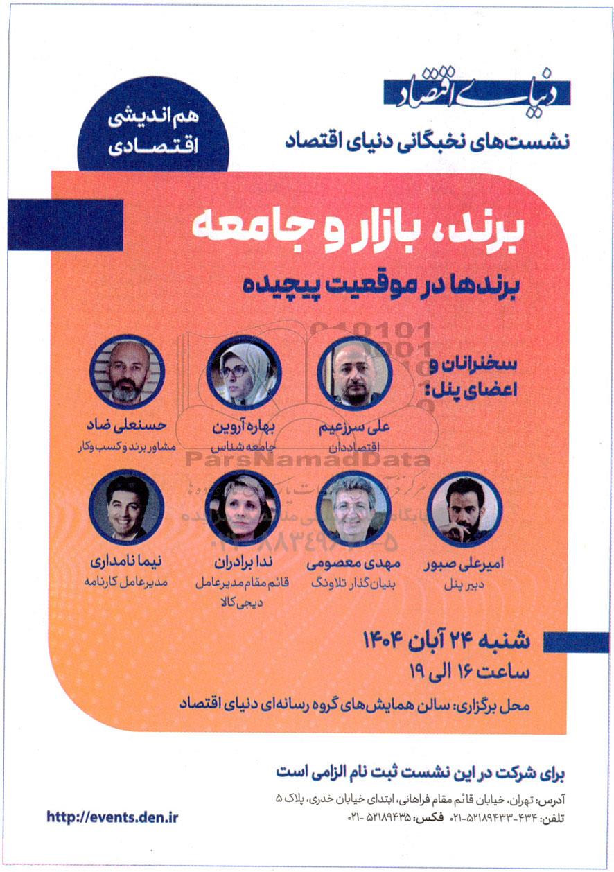 تلفن:5- 88349670 (021) فکس: 88349673 (021) Website: www.ParsNamadData.com E-mail: Info@ParsNamadData.com نشست های نخبگانی دنیای اقتصاد، هم اندیشی اقتصادی، برند، بازار و جامعه