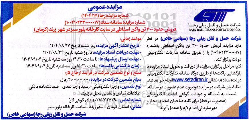 شرکت حمل و نقل ریلی رجا (سهامی خاص) در نظر دارد مزایده روش حدود 320 تن واگن اسقاطی به شماره (1004102230000017) را از طریق سامانه تدارکات الکترونیکی دولت برگزار کند