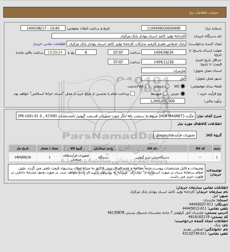 تلفن:5- 88349670 (021) فکس: 88349673 (021) Website: www.ParsNamadData.com E-mail: Info@ParsNamadData.com استعلام مگنت (HUB MAGNET) مربوط به سیلندر باله جگر جهت تجهیزات قسمت گیوتین