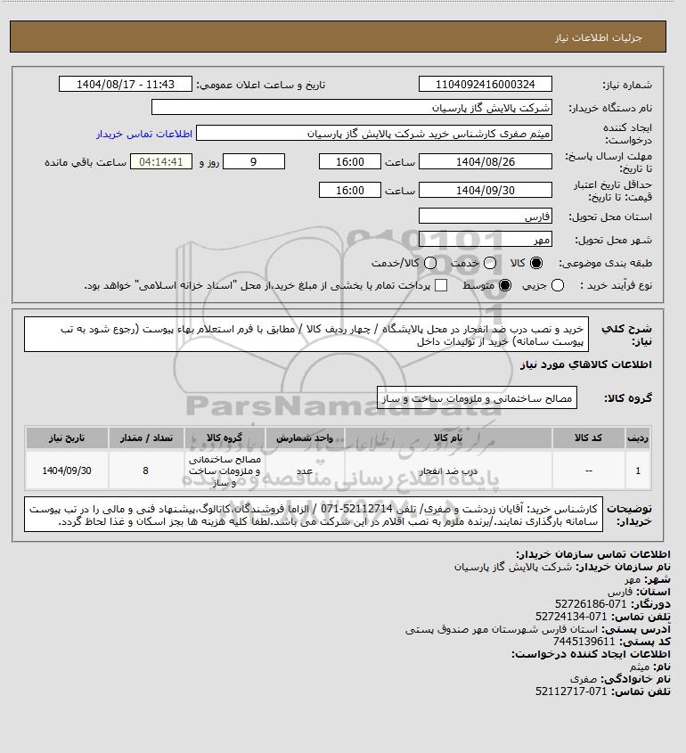 تلفن:5- 88349670 (021) فکس: 88349673 (021) Website: www.ParsNamadData.com E-mail: Info@ParsNamadData.com استعلام خرید و نصب درب ضد انفجار در محل پالایشگاه / چهار ردیف کالا / مطابق با فرم استعلام بهاء پیوست (رجوع شود به تب پیوست سامانه) خرید از تولیدات داخل