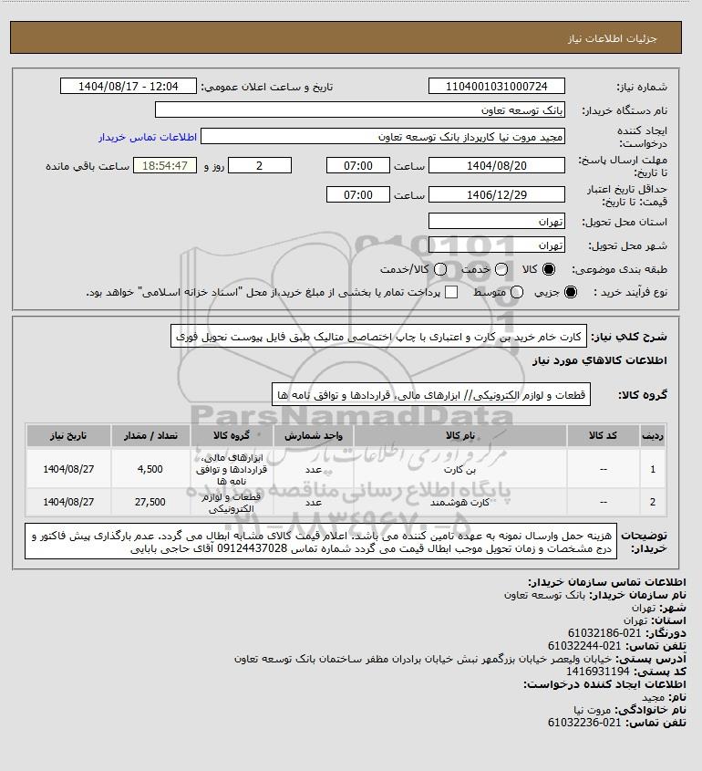 تلفن:5- 88349670 (021) فکس: 88349673 (021) Website: www.ParsNamadData.com E-mail: Info@ParsNamadData.com استعلام کارت خام خرید بن کارت و اعتباری با چاپ اختصاصی متالیک طبق فایل پیوست