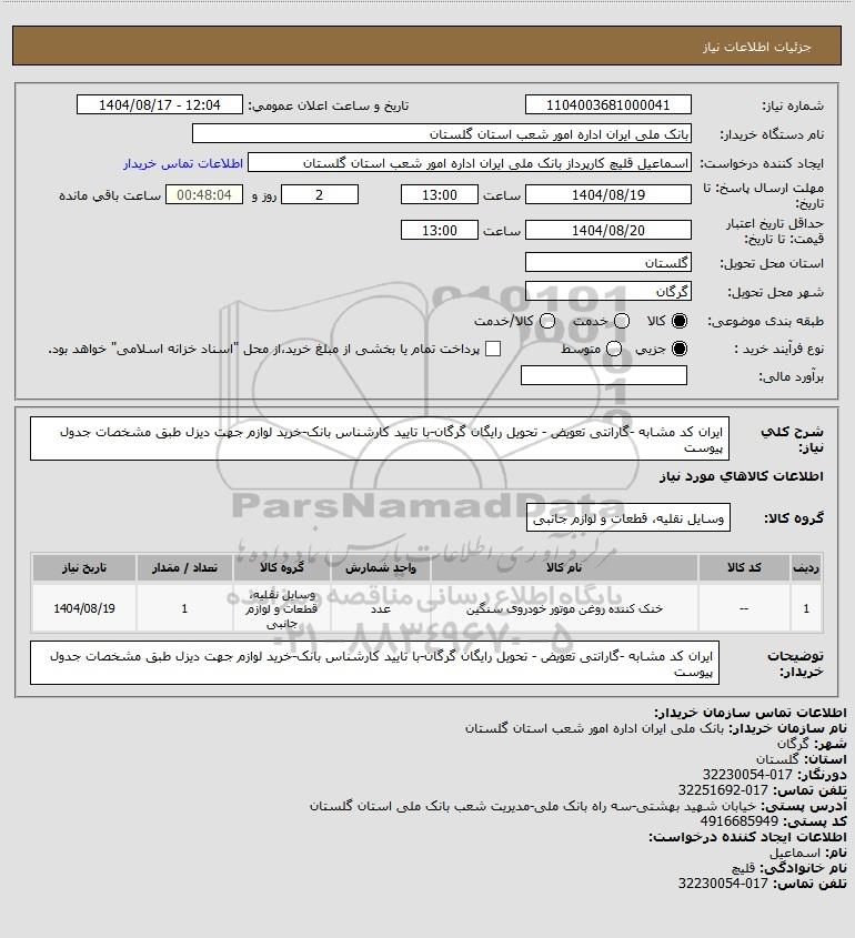 تلفن:5- 88349670 (021) فکس: 88349673 (021) Website: www.ParsNamadData.com E-mail: Info@ParsNamadData.com استعلام ایران کد مشابه -گارانتی تعویض - تحویل رایگان گرگان-با تایید کارشناس بانک-خرید لوازم جهت دیزل طبق مشخصات جدول پیوست