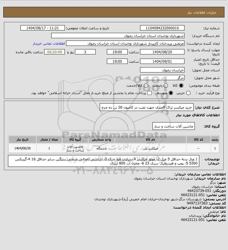 تلفن:5- 88349670 (021) فکس: 88349673 (021) Website: www.ParsNamadData.com E-mail: Info@ParsNamadData.com استعلام خرید میکسر تراک 8متری جهت نصب در کامیون 26 تن ده چرخ