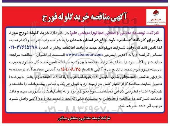 شرکت توسعه معدنی و صنعتی صبانور (سهامی عام) در نظر دارد خرید گلوله فورج مورد نیاز برای کارخانه کنسانتره خود واقع در استان همدان را به شرکت واجد شرایط واگذار نماید.