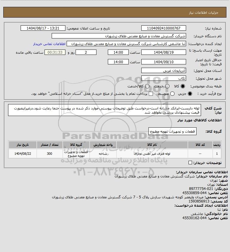 تلفن:5- 88349670 (021) فکس: 88349673 (021) Website: www.ParsNamadData.com E-mail: Info@ParsNamadData.com استعلام لوله داربست-ایرانکد مشابه است-درخواست طبق توضیحات پیوستی-موارد ذکر شده در پیوست حتما رعایت شود.درغیراینصورت قیمت پیشنهادی بررسی نخواهد شد