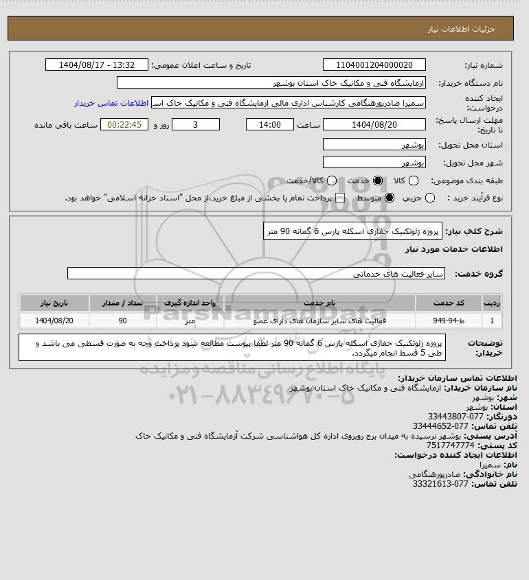 تلفن:5- 88349670 (021) فکس: 88349673 (021) Website: www.ParsNamadData.com E-mail: Info@ParsNamadData.com استعلام پروژه ژئوتکنیک حفاری اسکله پارس 6 گمانه 90 متر