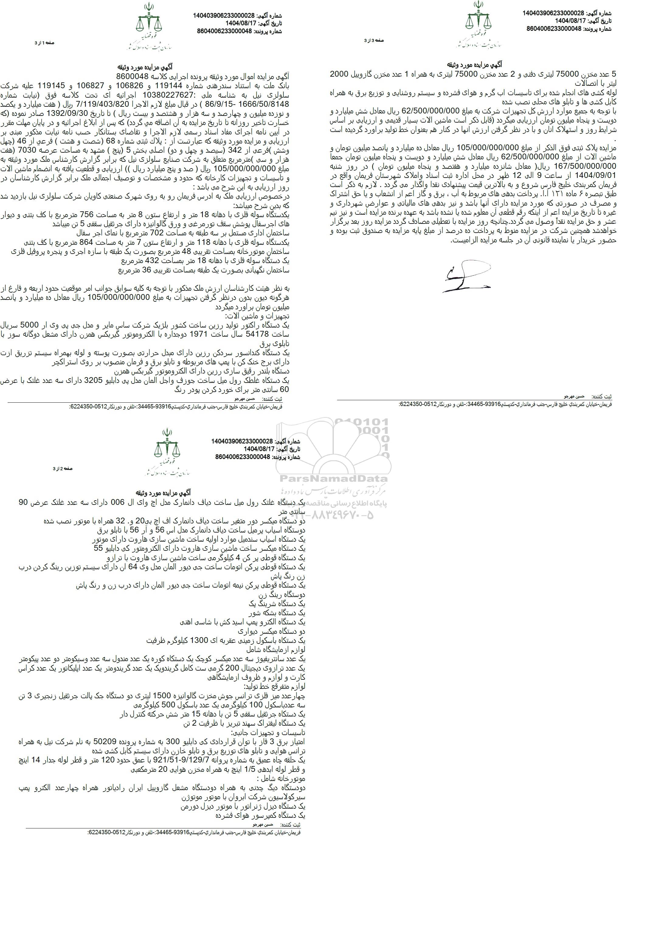 تلفن:5- 88349670 (021) فکس: 88349673 (021) Website: www.ParsNamadData.com E-mail: Info@ParsNamadData.com مزایده پلاک ثبتی شماره 68 شصت و هشت ، یکدستگاه سوله فری...