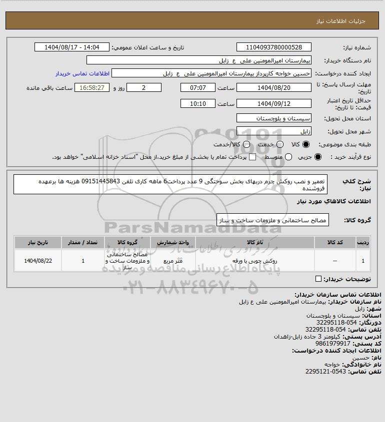 تلفن:5- 88349670 (021) فکس: 88349673 (021) Website: www.ParsNamadData.com E-mail: Info@ParsNamadData.com استعلام تعمیر و نصب روکش چرم دربهای بخش سوختگی 9 عدد