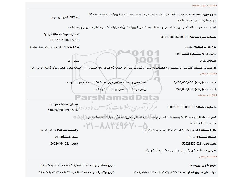 | عنوان آگهی: مزایده دو دستگاه کمپرسور با شاستی و متعلقات به نشانی کهریزک شورآباد خیابان 60 متری امام حسین ( ع ) خیابان ه |