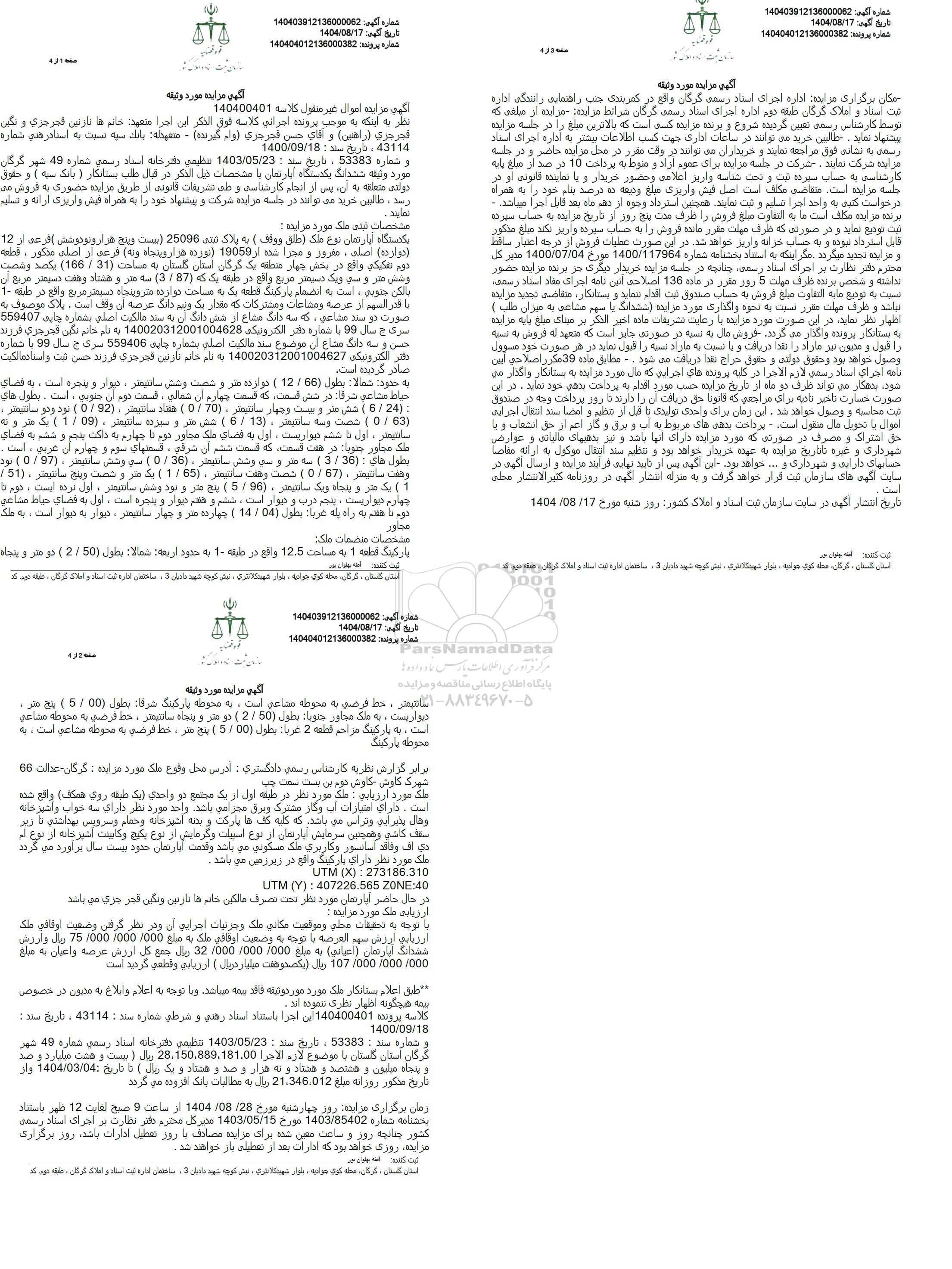 تلفن:5- 88349670 (021) فکس: 88349673 (021) Website: www.ParsNamadData.com E-mail: Info@ParsNamadData.com مزایده ششدانگ یک دستگاه آپارتمان نوع ملک (طلق و وقف) به پلاک ثبتی 25096 فرعی از 12 اصلی