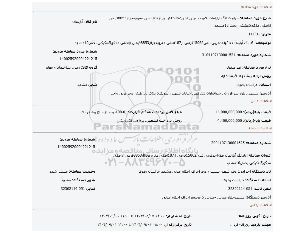 مزایده 6دانگ آپارتمان ط2واحدغربی ثبتی15062فرعی از187اصلی مفروزمجزااز8853فرعی ازاصلی مذکور5تفکیکی بخش10مشهد