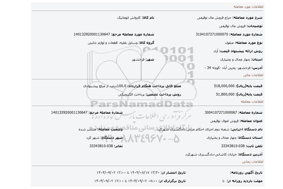 | عنوان آگهی: مزایده فروش مال توقیفی |