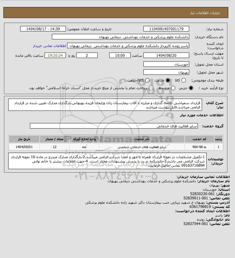 تلفن:5- 88349670 (021) فکس: 88349673 (021) Website: www.ParsNamadData.com E-mail: Info@ParsNamadData.com استعلام قرارداد سمپاشی طعمه گذاری و مبارزه با آفات بیمارستان زنان وزایمان فریده بهبهانی.بارگذاری مدارک تعیین شده در قرارداد الزامی میباشد.فایل پیوست میباشد