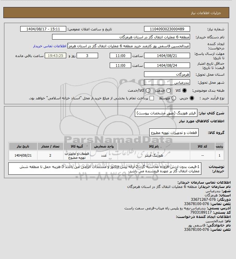 تلفن:5- 88349670 (021) فکس: 88349673 (021) Website: www.ParsNamadData.com E-mail: Info@ParsNamadData.com استعلام فیلتر هوزینگ (طبق مشخصات پیوست)