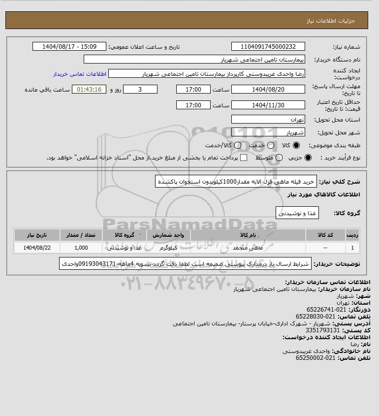 تلفن:5- 88349670 (021) فکس: 88349673 (021) Website: www.ParsNamadData.com E-mail: Info@ParsNamadData.com استعلام خرید فیله ماهی قزل الابه مقدار1000کیلوبدون استخوان پاکشده