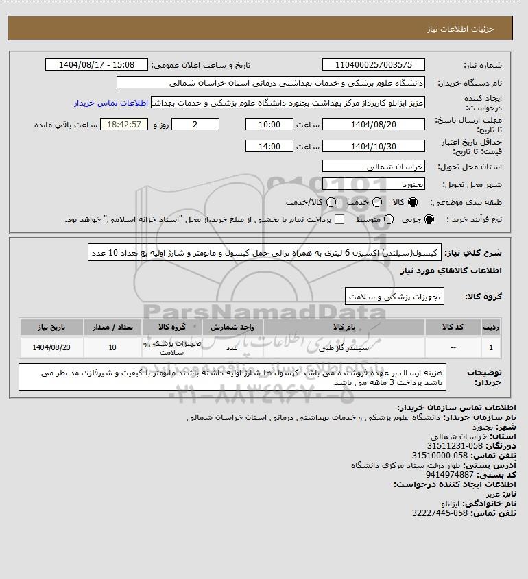 تلفن:5- 88349670 (021) فکس: 88349673 (021) Website: www.ParsNamadData.com E-mail: Info@ParsNamadData.com استعلام کپسول(سیلندر) اکسیزن 6 لیتری به همراه ترالی حمل کپسول و مانومتر و شارژ اولیه بع تعداد 10 عدد