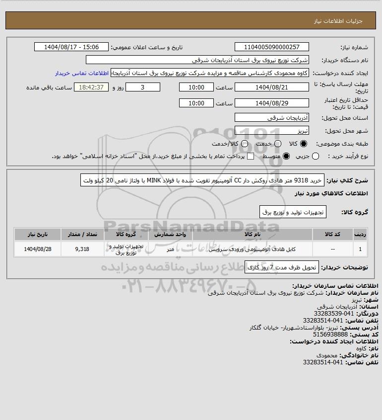 تلفن:5- 88349670 (021) فکس: 88349673 (021) Website: www.ParsNamadData.com E-mail: Info@ParsNamadData.com استعلام خرید 9318 متر هادی روکش دار CC آلومینیوم تقویت شده با فولاد MINK با ولتاژ نامی 20 کیلو ولت