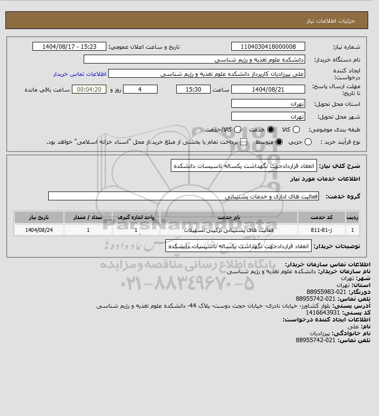 تلفن:5- 88349670 (021) فکس: 88349673 (021) Website: www.ParsNamadData.com E-mail: Info@ParsNamadData.com استعلام انعقاد قراردادجهت نگهداشت یکساله تاسیسات دانشکده