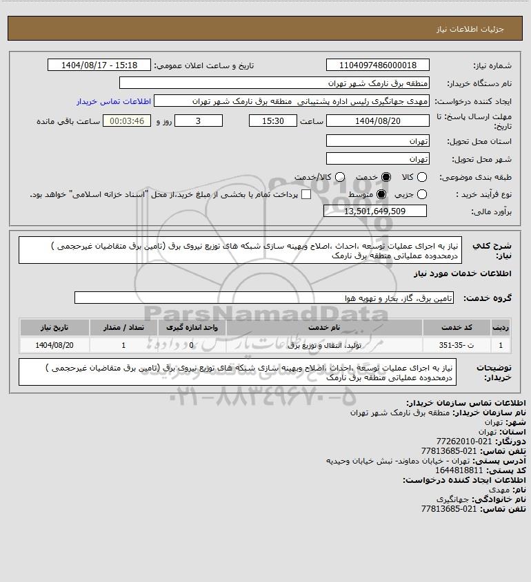 تلفن:5- 88349670 (021) فکس: 88349673 (021) Website: www.ParsNamadData.com E-mail: Info@ParsNamadData.com استعلام نیاز به اجرای عملیات توسعه احداث اصلاح وبهینه سازی شبکه های توزیع نیروی برق (تامین برق متقاضیان غیرحجمی ) درمحدوده عملیاتی منطقه برق نارمک