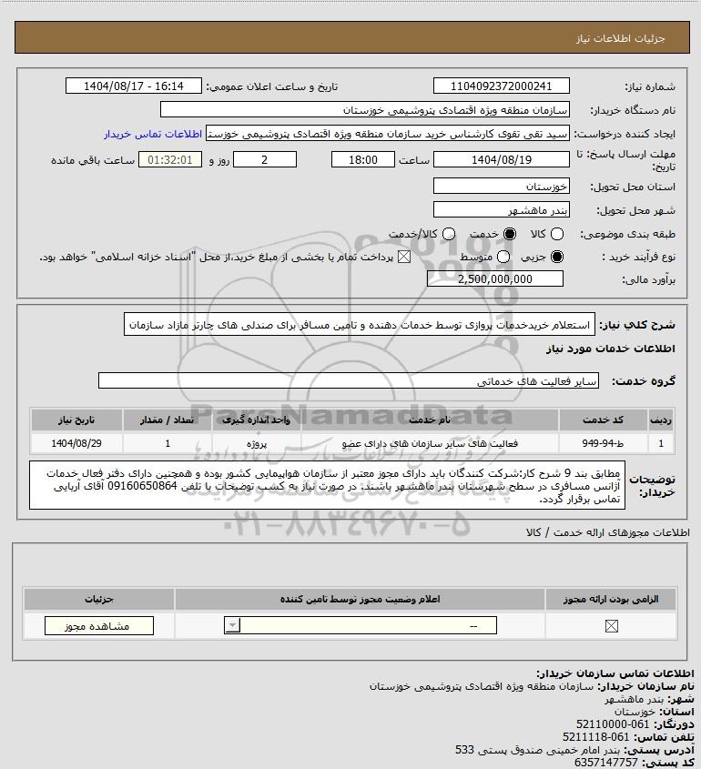 تلفن:5- 88349670 (021) فکس: 88349673 (021) Website: www.ParsNamadData.com E-mail: Info@ParsNamadData.com استعلام استعلام خریدخدمات پروازی توسط خدمات دهنده و تامین مسافر برای صندلی های چارتر مازاد سازمان