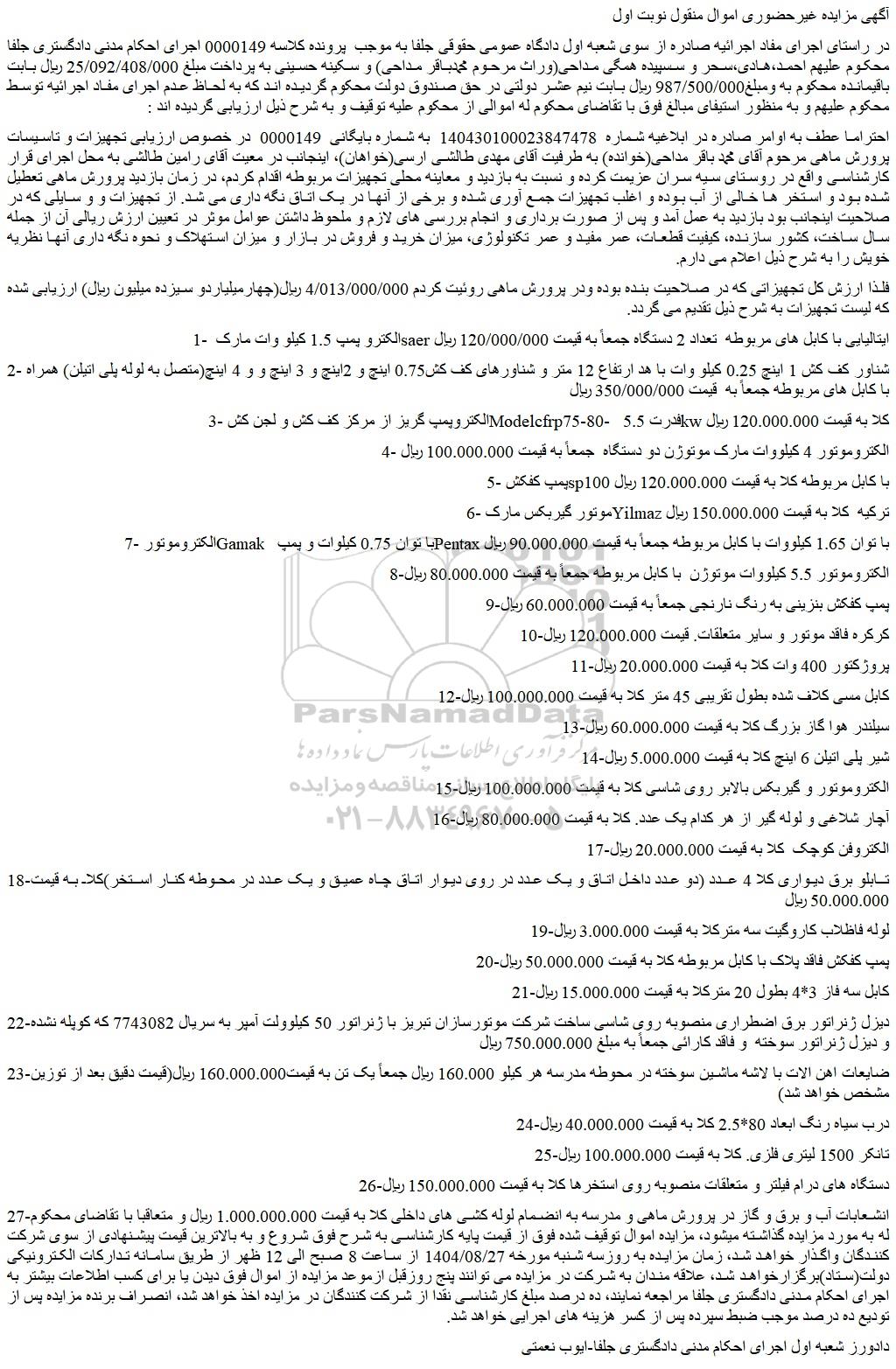 در راستای اجرای مفاد اجرائیه صادره از سوی شعبه اول دادگاه عمومی حقوقی جلفا به موجب پرونده کلاسه 0000149 اجرای احکام مدنی دادگستری جلفا محکوم علیهم احمد،هادی،سحر و سسپیده همگی مداحی(وراث مرحوم محمدباقر مداحی) و سکینه حسینی به پرداخت مبلغ 25/092/408/000 ریال بابت باقیمانده محکوم به ومبلغ987/500/000 ریال بابت نیم عشر دولتی در حق صندوق دولت محکوم گردیده اند که به لحاظ عدم اجرای مفاد اجرائیه توسط محکوم علیهم و به منظور استیفای مبالغ فوق با تقاضای محکوم له اموالی از محکوم علیه توقیف و به شرح ذیل ارزیابی گردیده اند :