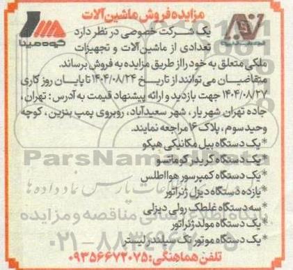 تلفن:5- 88349670 (021) فکس: 88349673 (021) Website: www.ParsNamadData.com E-mail: Info@ParsNamadData.com مزایده فروش تعدادی از ماشین آلات و تجهیزات ملکی ...