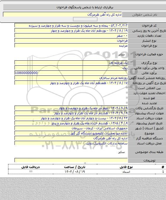 تلفن:5- 88349670 (021) فکس: 88349673 (021) Website: www.ParsNamadData.com E-mail: Info@ParsNamadData.com مزایده اجاره دپو تعمیرات لکوموتیو ایستگاه گل گهر