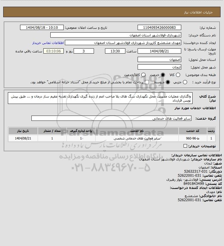 تلفن:5- 88349670 (021) فکس: 88349673 (021) Website: www.ParsNamadData.com E-mail: Info@ParsNamadData.com استعلام واگذاری عملیات مدیریت محل نگهداری سگ های بلا صاحب اعم از زنده گیری نگهداری تغذیه عقیم ساز درمان و ...