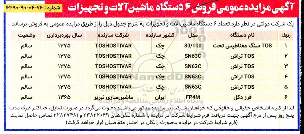 تلفن:5- 88349670 (021) فکس: 88349673 (021) Website: www.ParsNamadData.com E-mail: Info@ParsNamadData.com مزایده عمومی فروش 6 دستگاه ماشین آلات و تجهیزات
