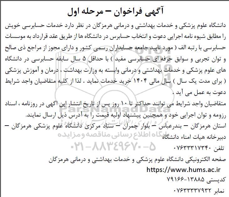 دانشگاه علوم پزشکی و خدمات بهداشتی و درمانی هرمزگان در نظر دارد خدمات حسابرسی خویش را مطابق شیوه نامه اجرایی دعوت و انتخاب حسابرس در دانشگاهها از طریق عقد قرارداد به موسسات حسابرسی با رتبه الف مورد تایید جامعه حسابداران رسمی کشور و دارای مجوز از مراجع ذی صالحو توان تجربی و سوابق حرفه ای حسابرسی مفید ) با حداقل 5 سال سابقه حسابرسی در دانشگاه های علوم پزشکی و خدمات بهداشتی و درمانی وابسته به وزارت بهداشت، درمان و آموزش پزشکی برای مدت یک سال) سال مالی 1404 خرید خدمات نماید. لذا از کلیه متقاضیان واجد شرایط دعوت به عمل می آید .