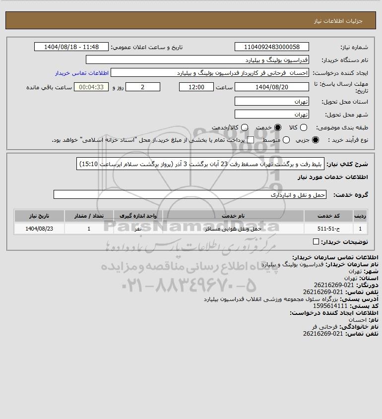 تلفن:5- 88349670 (021) فکس: 88349673 (021) Website: www.ParsNamadData.com E-mail: Info@ParsNamadData.com استعلام بلیط رفت و برگشت تهران مسقط رفت 23 آبان برگشت 3 آذر (پرواز برگشت سلام ایرساعت 15:10)
