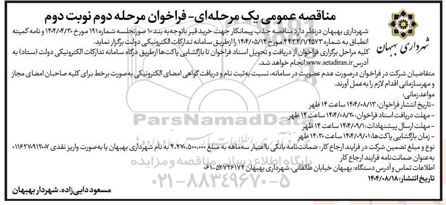 شهرداری بهبهان در نظر دارد مناقصه جذب پیمانکار جهت خرید قیر با توجه به بند 10 صورتجلسه شماره 191 مورخ 1404.04.30 و نامه کمیته انطباق به شماره 4433/1/4573 مورخ 1404.05.14 را از طریق سامانه تدارکات الکترونیکی دولت برگزار نماید.