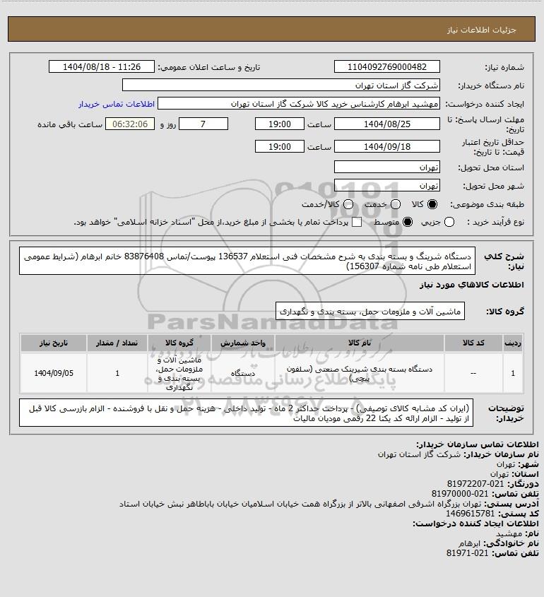 تلفن:5- 88349670 (021) فکس: 88349673 (021) Website: www.ParsNamadData.com E-mail: Info@ParsNamadData.com استعلام دستگاه شرینگ و بسته بندی به شرح مشخصات فنی استعلام 136537 پیوست/تماس 83876408 خانم ابرهام (شرایط عمومی استعلام طی نامه شماره 156307)