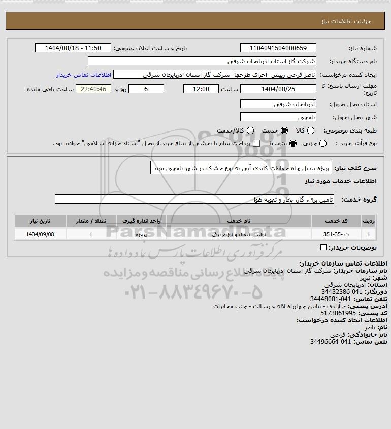 تلفن:5- 88349670 (021) فکس: 88349673 (021) Website: www.ParsNamadData.com E-mail: Info@ParsNamadData.com استعلام پروژه تبدیل چاه حفاظت کاتدی آبی به نوع خشک در شهر یامچی مرند