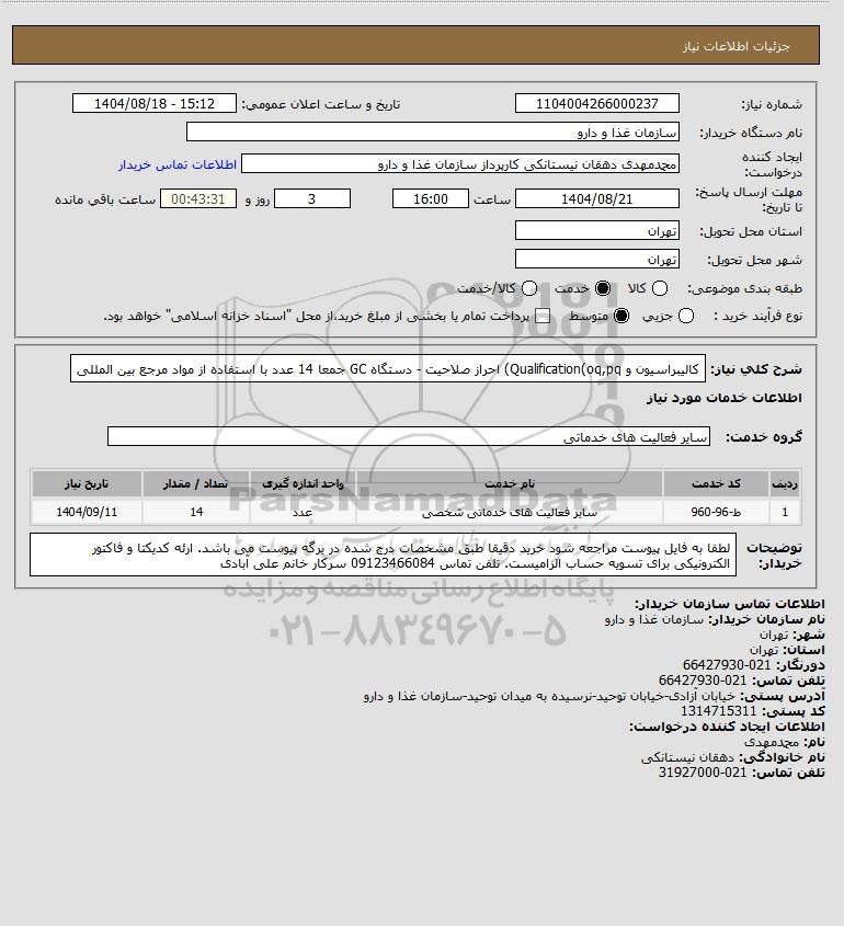 تلفن:5- 88349670 (021) فکس: 88349673 (021) Website: www.ParsNamadData.com E-mail: Info@ParsNamadData.com استعلام کالیبراسیون و Qualification(oqpq) احراز صلاحیت - دستگاه GC جمعا 14 عدد با استفاده از مواد مرجع بین المللی