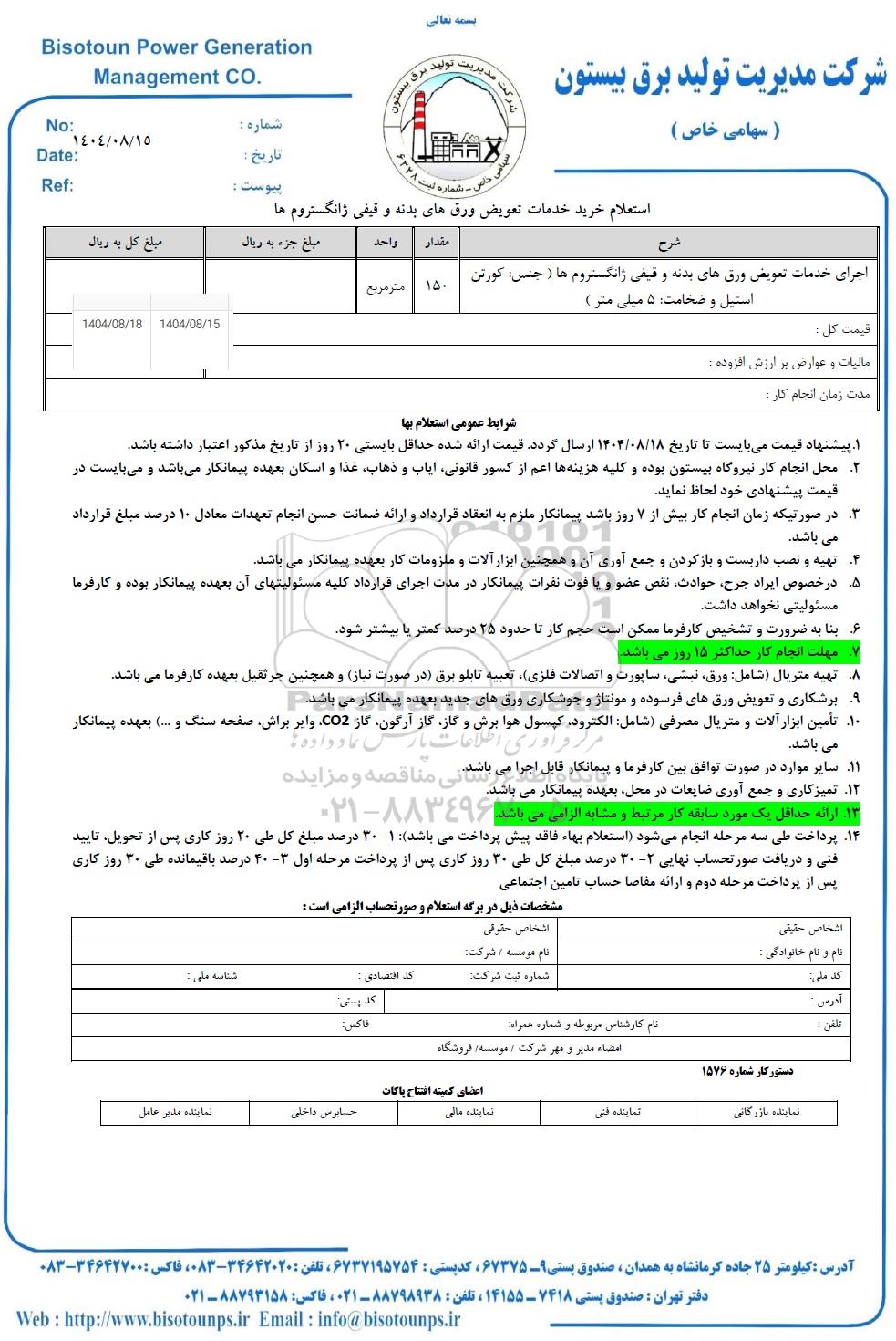 | عنوان آگهی: استعلام خرید خدمات تعویق ورق های بدنه و قیفی ژانگستروم ها |
