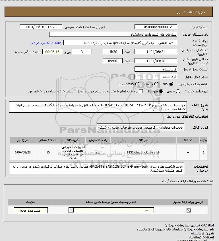 تلفن:5- 88349670 (021) فکس: 88349673 (021) Website: www.ParsNamadData.com E-mail: Info@ParsNamadData.com استعلام خرید 16عدد هارد سرور