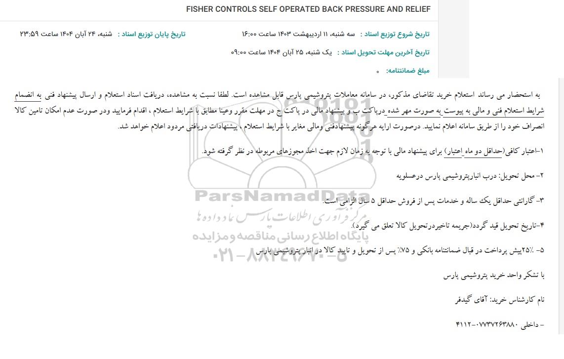| عنوان آگهی: استعلام FISHER CONTROLS SELF OPERATED BACK PRESSURE AND RELIEF |