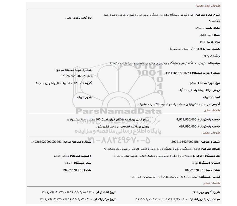 | شماره معامله: 3004106427000256 | | شماره معامله مرجع: 140268920002920263 | | عنوان معامله: فروش دستگاه تراش و رولینگ و برش زنی و قیچی اهرمی و غیره بابت محکوم به | | نام دستگاه اجرایی: شعبه دوم اجرای احکام مدنی مجتمع قضایی شهید مطهری تهران | | وضعیت معامله: منتشر شده | | استان دستگاه: تهران | | شهر دستگاه: تهران | | تلفن ثابت: 021-66224468 | | نمابر: 021-66224468 | | آدرس دستگاه: تهران منطقه 18 چهارراه یافت آباد بلوار معلم میدان معلم |