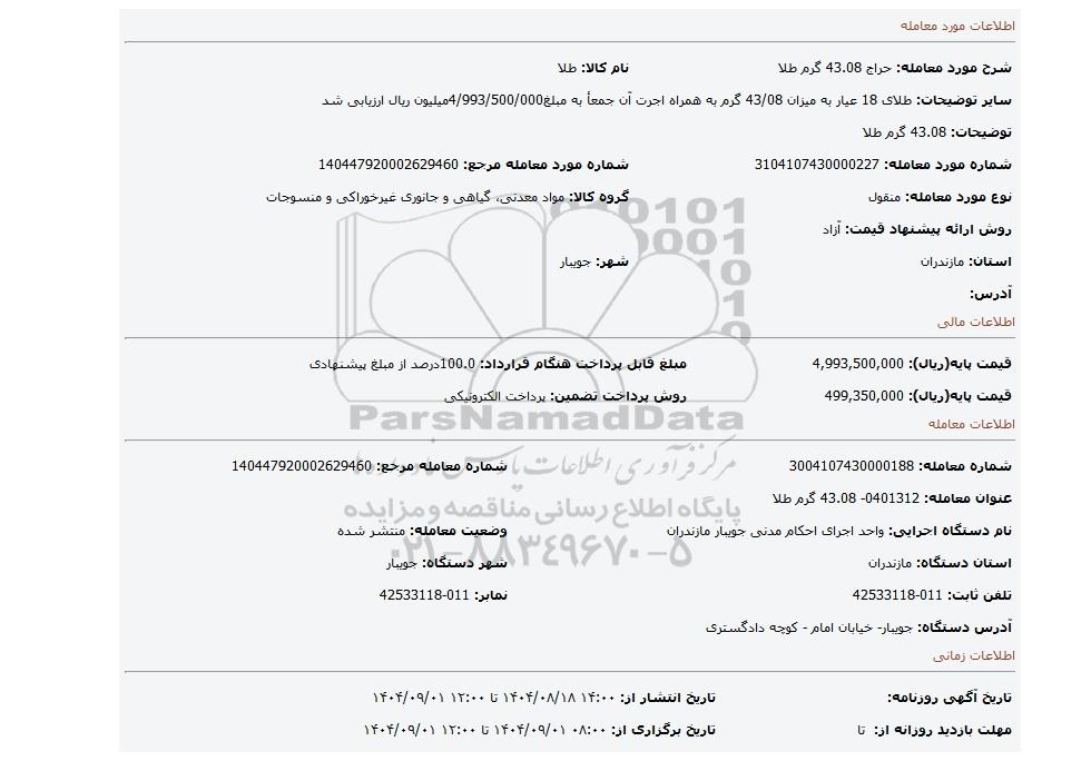 | عنوان آگهی: مزایده 43.08 گرم طلا |