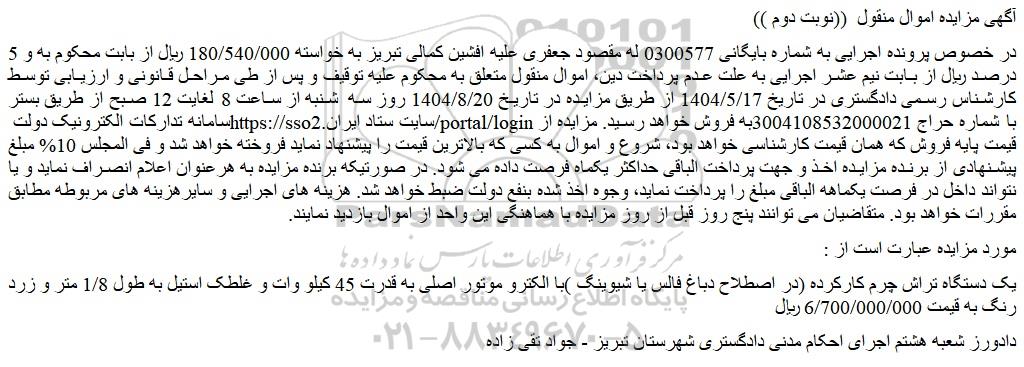 تلفن:5- 88349670 (021) فکس: 88349673 (021) Website: www.ParsNamadData.com E-mail: Info@ParsNamadData.com مزایده یک دستگاه تراش چرم کارکرده (در اصطلاح دباغ فالس یا شیوینگ )با الکترو موتور اصلی