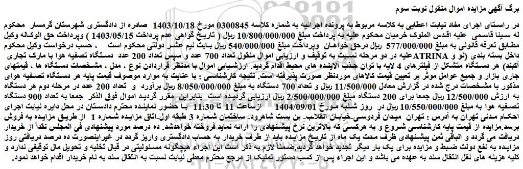 در راستای اجرای مفاد نیابت اعطایی به کلاسه مربوط به پرونده اجرائیه به شماره کلاسه 0300845 مورخ 1403/10/18 صادره از دادگستری شهرستان گرمسار محکوم له سینا قاسمی علیه اقدس الملوک خرمیان محکوم علیه به پرداخت مبلغ 10/800/000/000 ریال ( تاریخ گواهی عدم پرداخت 1403/05/15 ) وپرداخت حق الوکاله وکیل مطابق تعرفه قانونی به مبلغ 577/000/000 ریال درحق خواهان وپرداخت مبلغ 540/000/000 ریال بابت نیم عشر دولتی محکوم است ، حسب درخواست وکیل محکوم علیه در دو مرحله نسبت به توقیف و ارزیابی اموال منقول تعداد 700 عدد و سپس تعداد 200 عدد دستگاه تصفیه هوا با مارک تجاری atrina داخل بسته بندی (نو و آکبند) هر دستگاه متشکل از فیلترهای 4 لایه با توان جذب آلاینده های محیط اقدام گردید. ارزشیابی اموال با مدنظر قراردادن نوع ، مدل ، مشخصات دستگاه ها ، قیمتهای جاری بازار و جمیع عوامل موثر بر تعیین قیمت کالاهای موردنظر صورت پذیرفته است. نتیجه کارشناسی : با عنایت به موارد موصوف قیمت پایه هر دستگاه تصفیه هوای مذکور با مشخصات درج شده در گزارش معادل 11/500/000 ریال و تعداد 700 دستگاه به مبلغ 8/050/000/000 ریال برآورد و تعداد 200 عدد در مرحله دوم هر دستگاه به ارزش 12/500/000 ریال جمعا برای 200 دستگاه مبلغ 2/500/000/000 ریال ارزیابی گردیده است بنابراین مقرر گردید اموال فوق الذکر جمعا به تعداد 900 دستگاه تصفیه هوا به مبلغ 10/550/000/000 ریال در روز شنبه مورخ 1404/09/01 ازساعت 11 تا 11:30 با حضور نماینده محترم دادستان در محل دایره نیابت اجرای احکام مدنی تهران به آدرس : تهران میدان فردوسی-خیابان انقلاب- بن بست شاهرود- ساختمان شماره 3 طبقه اول-اتاق مزایده شماره 1 از طریق مزایده به فروش برسد.مزایده از قیمت پایه کارشناسی شروع و به هرکسی که بالاترین نرخ پیشنهادی را ارائه نماید فروخته خواهدشد. ده درصد مورد پیشنهادی فی المجلس نقداً از خریدار دریافت می گردد و الباقی ثمن پیشنهادی ظرف مدت یک ماه از تاریخ مزایده باید از طرف خریدار به حساب دادگستری واریز گردد در غیراینصورت ده درصد دریافتی روز مزایده به نفع دولت ضبط و مزایده برای یک بار دیگر تجدید خواهد گردید.ضمناً لازم به ذکر است این اجراء هیچگونه مسئولیتی در قبال تخلیه و تحویل مال توقیفی ندارد و کلیه هزینه های نقل انتقال سند به عهده می باشد و این اجراء پس از کسب دستور تملیک از مرجع محترم معطی نیابت نسبت به انتقال سند به نام خریدار اقدام خواهد نمود.